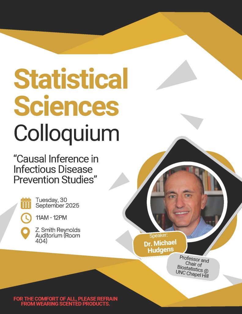 Professor Hudgens has co-authored more than 300 peer-reviewed papers in statistical journals such as Biometrics, Biometrika, JASA and JRSS-B as well as biomedical journals such as the Lancet, Nature and New England Journal of Medicine. He currently serves as an associate editor for Biometrics. He is an elected fellow of the American Statistical Association and has taught graduate-level biostatistics courses at UNC for over 15 years.Dr. Hudgens’s talk is entitled