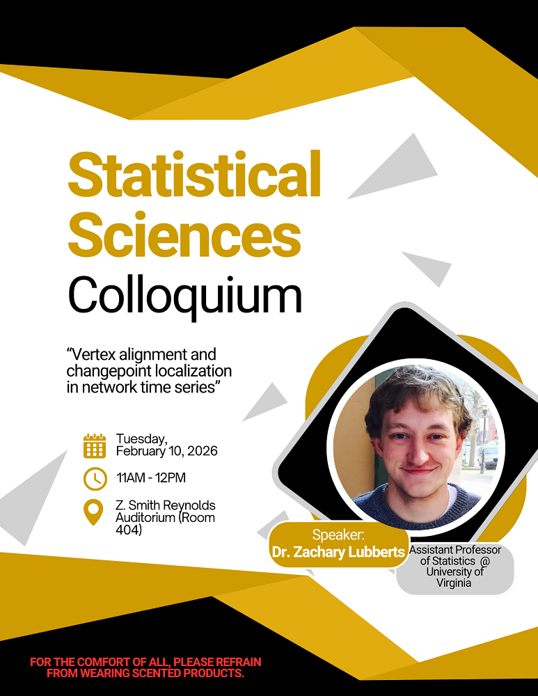 Dr. Zach Lubberts will be presenting at 11 AM in the Z. Smith Reynolds (ZSR) Auditorium, Room 404. Dr. Li’s talk is entitled “Vertex alignment and changepoint localization in network time series.”